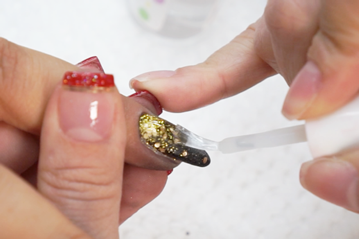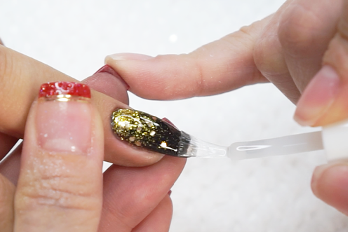 - Carefully apply Step 2 Base over the entire nail & immediately pour Base & Finish onto nail to seal the glitter.