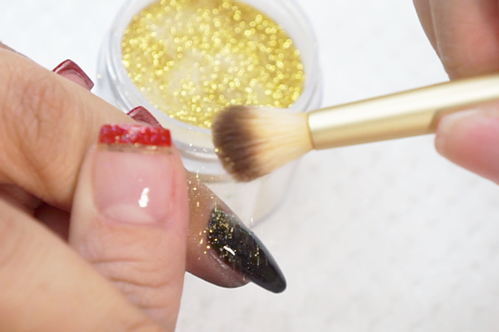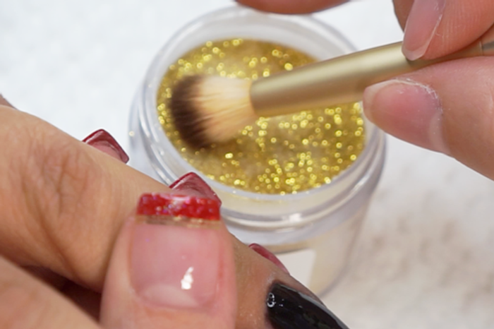 - Apply another coat of Step 2 Base. Then using a fluffy eyeshadow brush, tap GL12 onto the top of the nail plate.