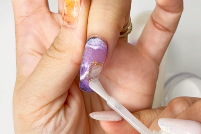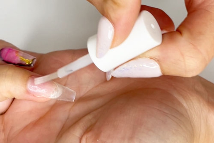 - Use a dry lint-free wipe to remove any excess activator from the nail surface.