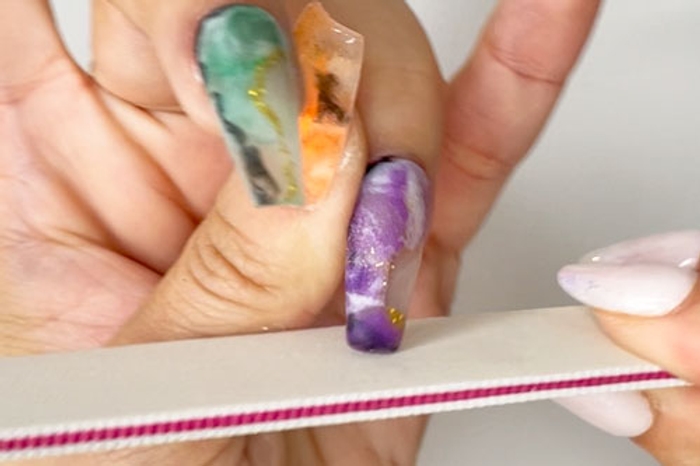 - File and buff nails to achieve desired shape and smoothness.