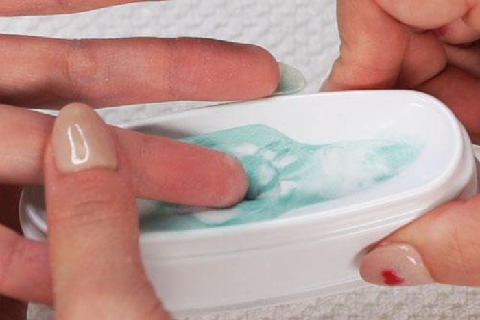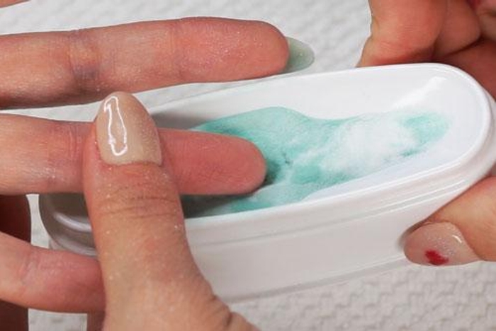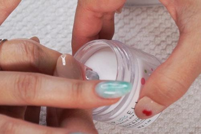 - Paint a thin coat of Step 2 Base and immediately press the nail bed downwards onto the acrylic powder mix.