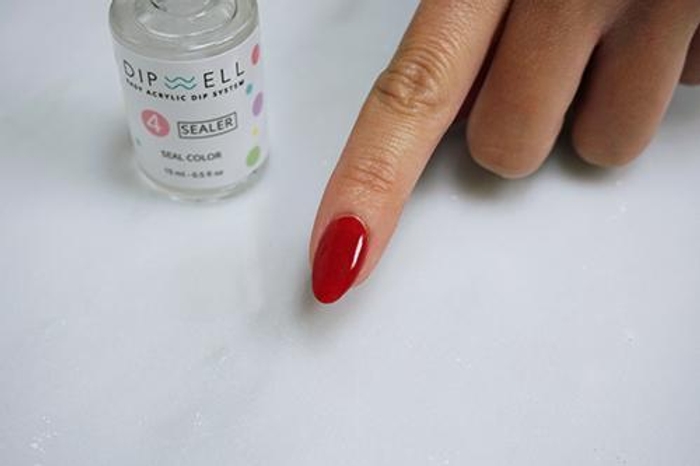 - Quickly dip the nail at a 45-degree angle into the choice of acrylic color powder coating the entire nail bed