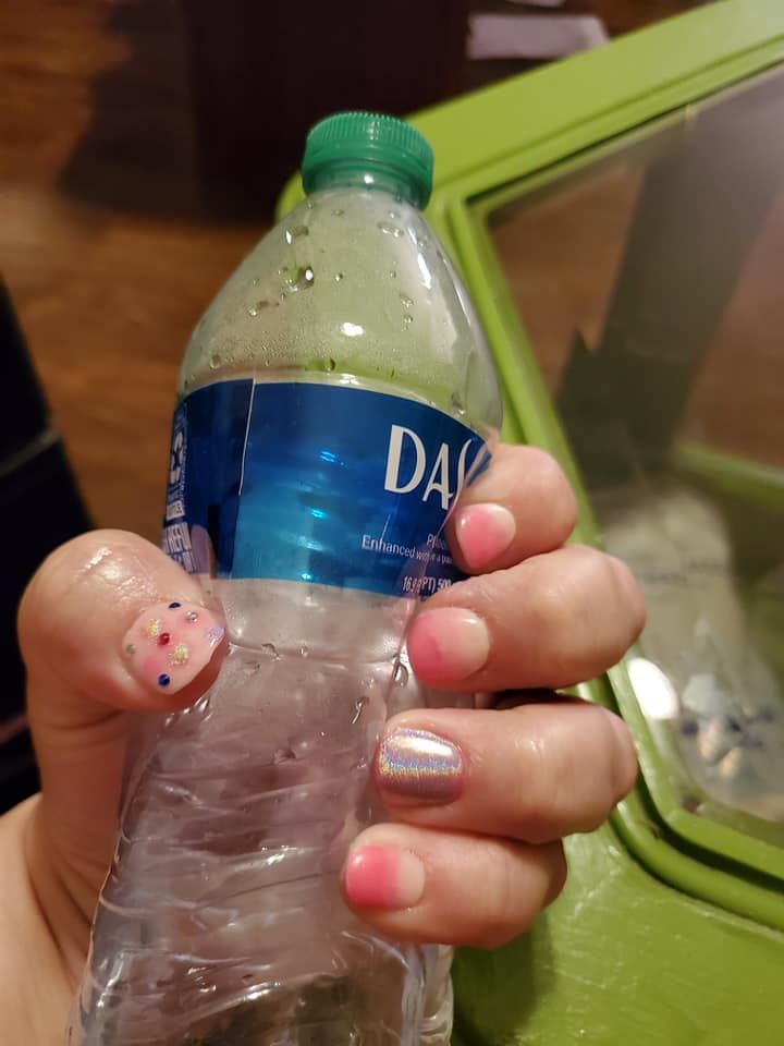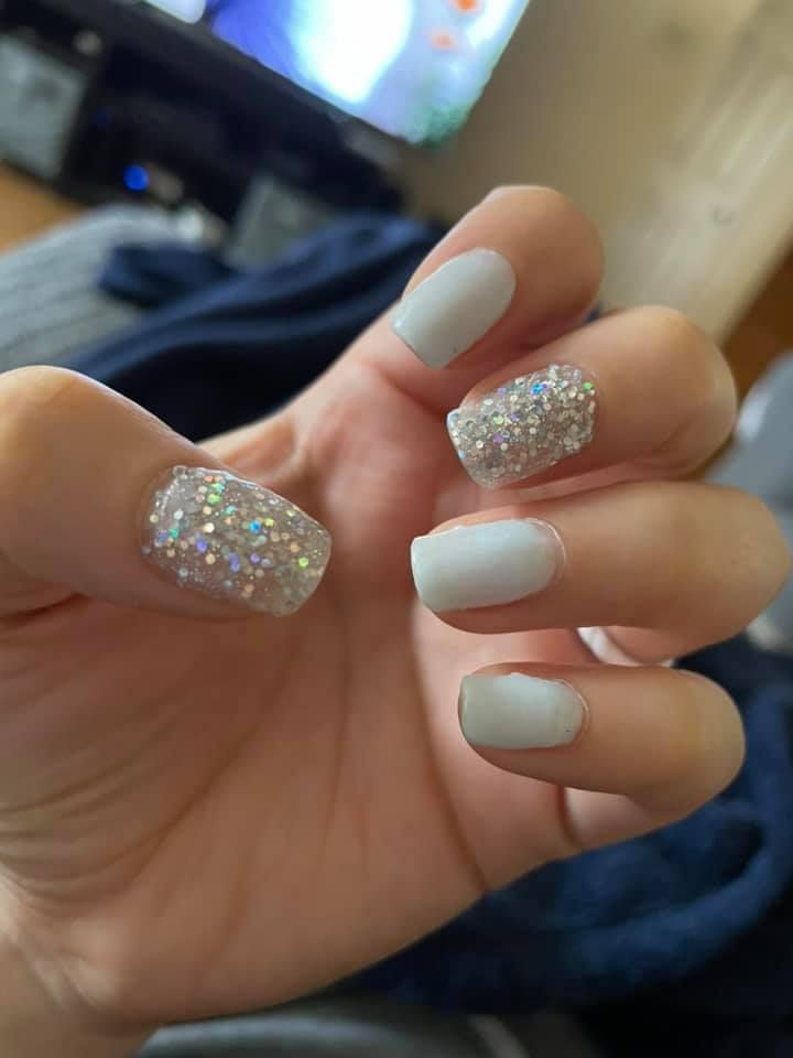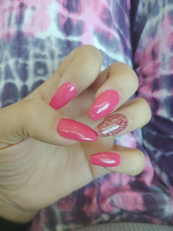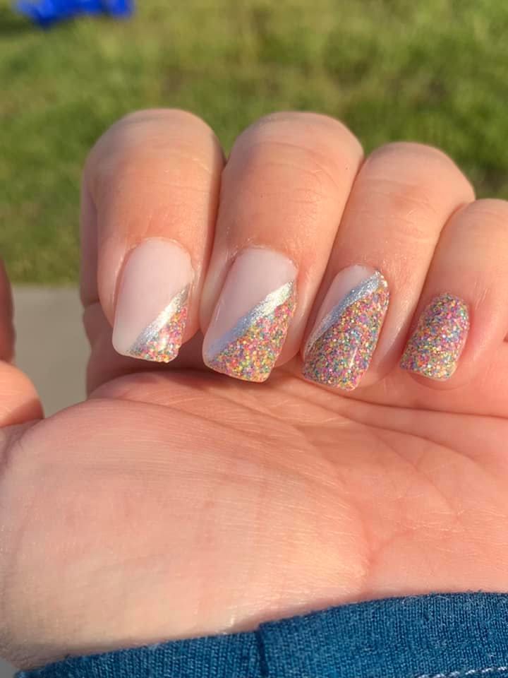 How sparkly this many is! Glittery birthday manicure by Erica Sandoval Urdanivia. She used CL 34 Taffy Pink dip powder for her thumb, index, and pinky fingers.