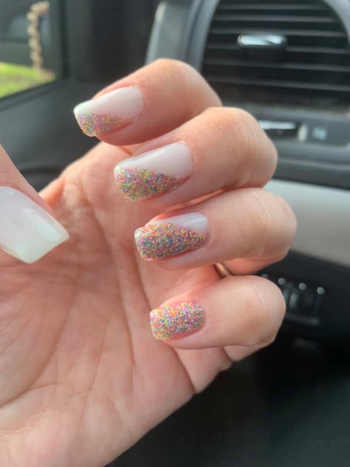 Fantabulous birthday claws courtesy of Hannah Harris Ward, featuring PA 2 Soft Jade and NA 2 Light Peachy Sand dip powders. Have a cute party finger using the limited edition birthday funfetti dip powder. When you wear this style, it’ll be the sweetest birthday mani anyone has seen!