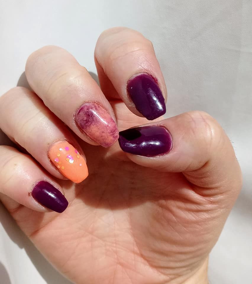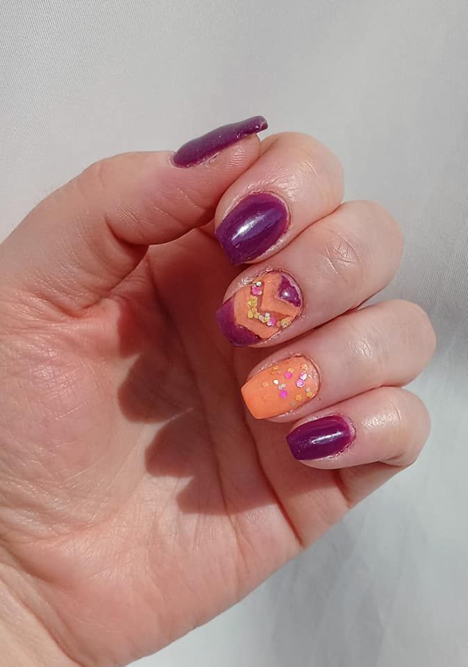 Birthday color combo courtesy of Cheril Petroni. How beautiful these dip nail colors pair together! Try your hand at colorblocking and marbling for your birthday with a good purple and a bright pop of color. NA 06 Sherbet Orange dip color from the Naturale Dip Powder collection fits the bill! If you’re new to colorblocking or marbling, follow these tutorials: