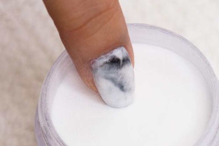 - Quickly press the nail flat down onto the marble dip powder