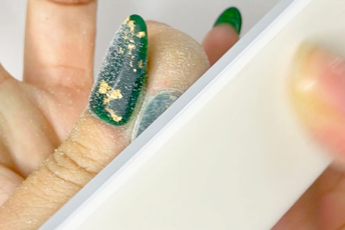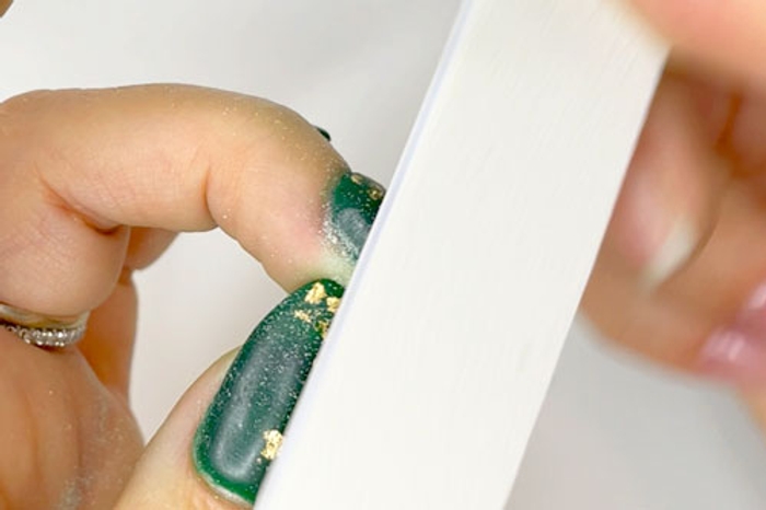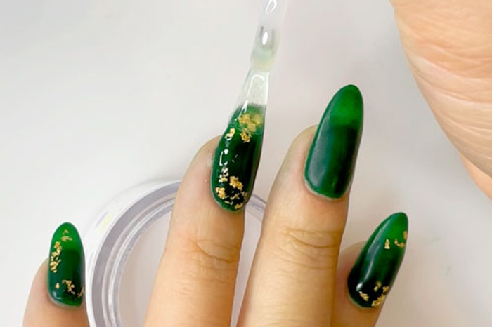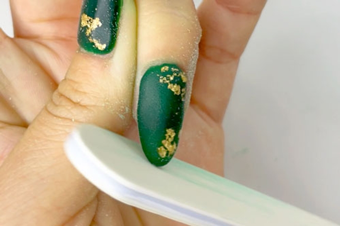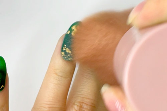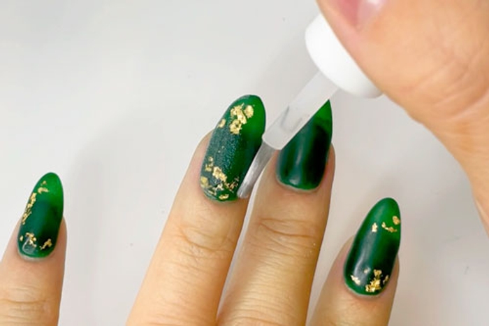 - Apply a coat of Step 4 Sealer to the entire nail. Use a toothpick to pick up Gold Flake pieces and gently place them on the nail.