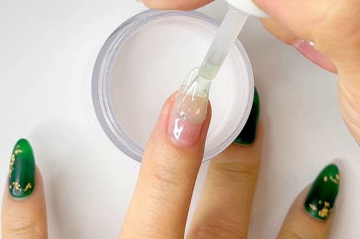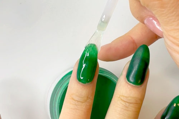 - Apply a coat of Step 2 Base to the entire nail and immediately dip fingernail into Base & Finish powder.