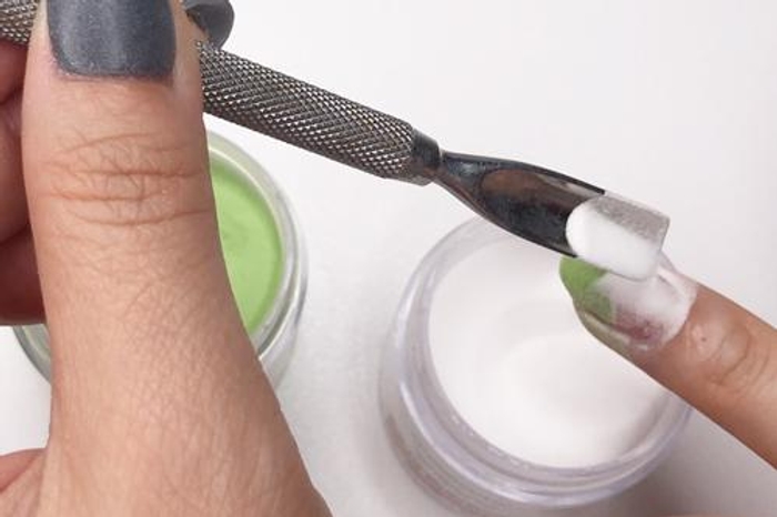 - Apply a thin coat of Step 2 Base on the entire nail and immediately dip the nail, at an angle, into CL-02 to create a slanted French look. Follow by pouring Base & Finish powder over the remaining wet base.