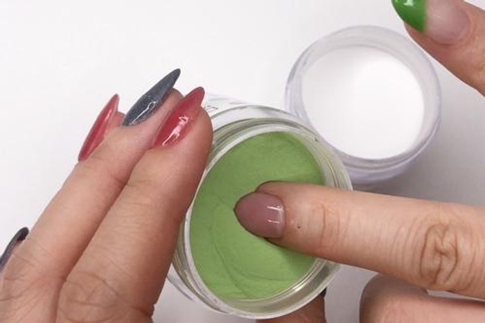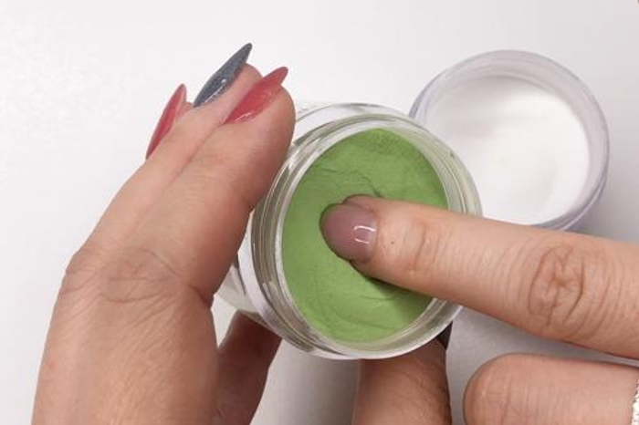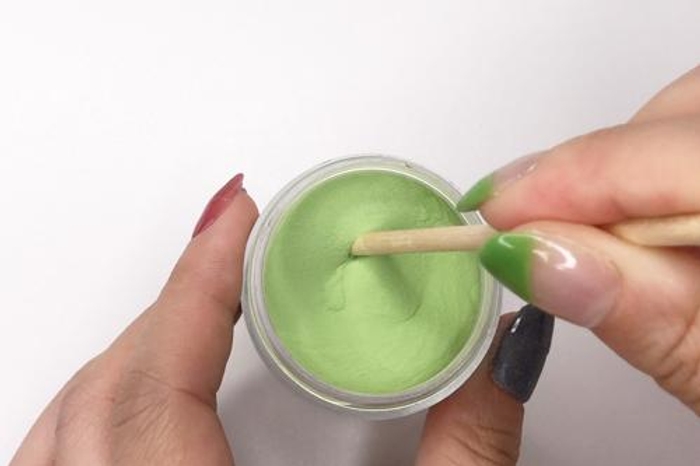 - Be sure to stir your dip powders before application. For this look, we are using shade CL-02 and Base & Finish powder.