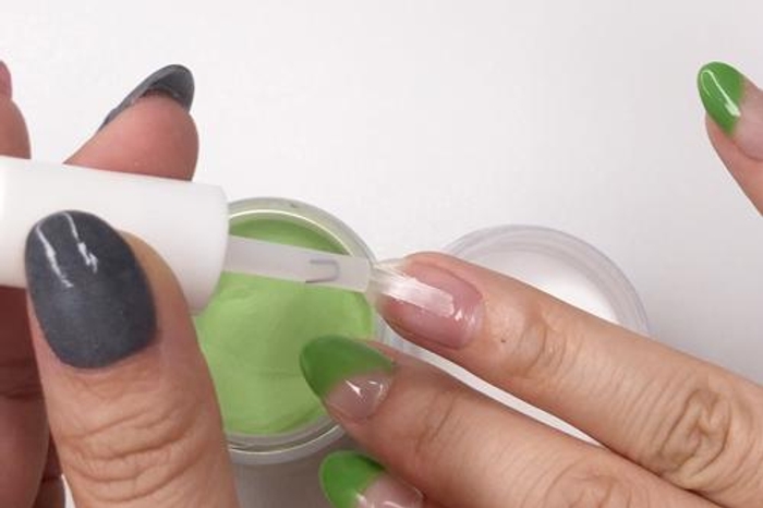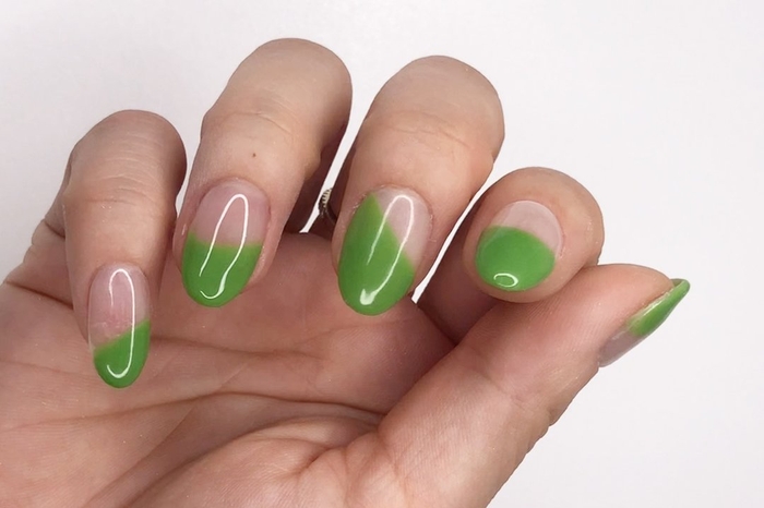 - Create a negative space mani with lime green dip power. Enjoy this abstract nail art with bright green dip powder that leaves negative space to let your nails shine through.