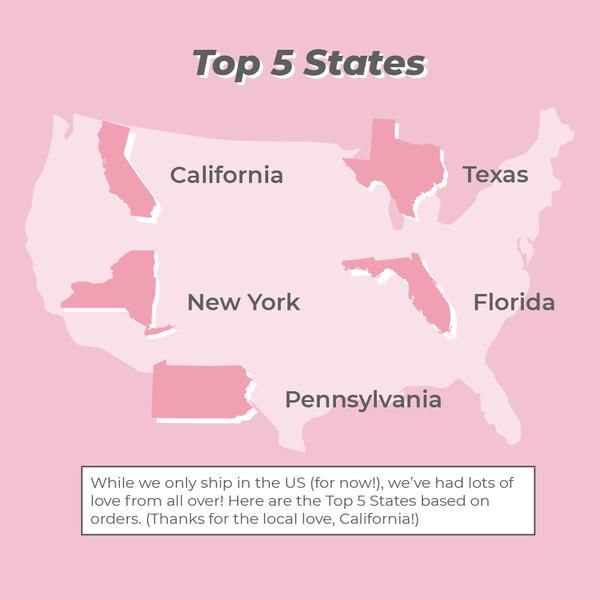 We love our dippers wherever they live, but California, Texas, New York, Florida, and Pennsylvania placed the most orders this year. (Thanks for the local love, CA!)