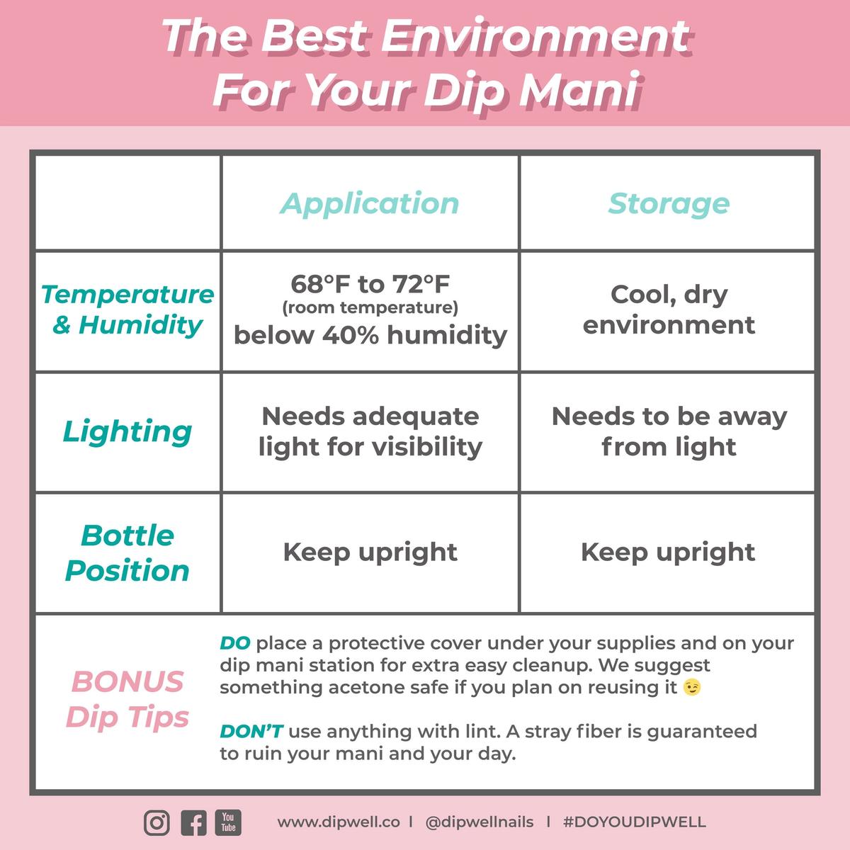 Dipping products are temperature sensitive. That’s why you have to avoid leaving them in humid conditions. Humidity can alter the chemical makeup of your dip powder and dip liquids and *gasp* even make them unusable.