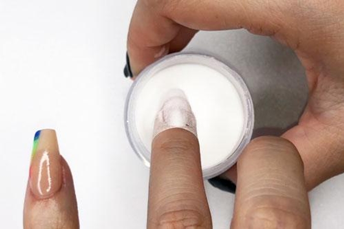 - Paint a thin coat of Step 2 Base over the left half of the nail and dip immediately into Base & Finish powder. Tap finger to remove loose powder.