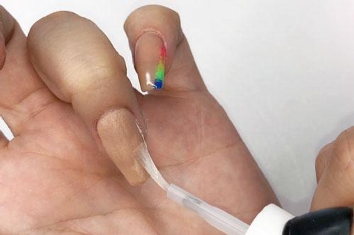 - Paint a coat of Step 2 Base onto the left section of nail & immediately spoon a small amount each of each color over the nail. Tap finger to rid of loose powder.