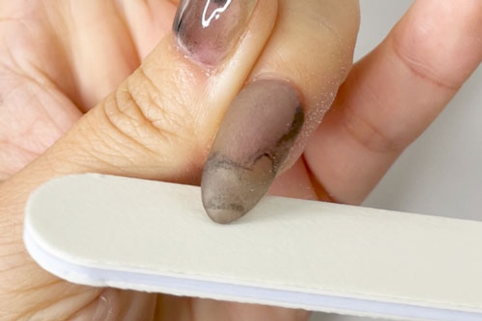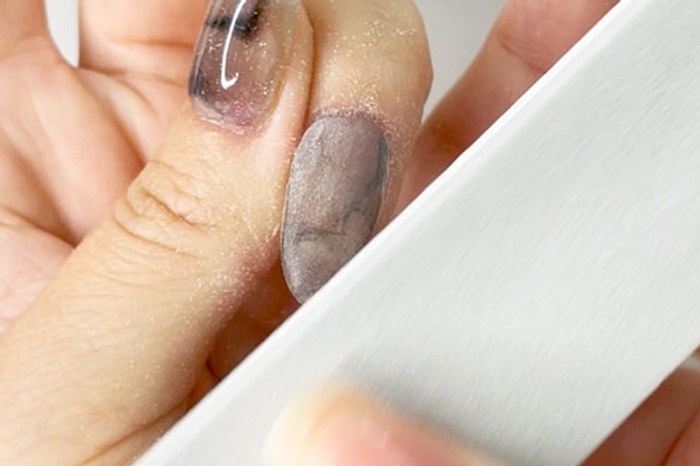 - File and buff nail to achieve desired nail shape and smoothness.