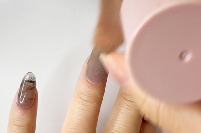 - Apply a coat of Step 2 Base to the entire nail, then gently lay the nail into the swirled dip powder.
