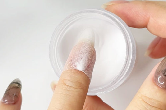 - Tap finger to remove loose powder. Follow by using a pointed tool, like a toothpick or Jelly Pusher, to clean around the cuticles. Then use a fluffy brush to sweep off any excess powder from the nail surface.