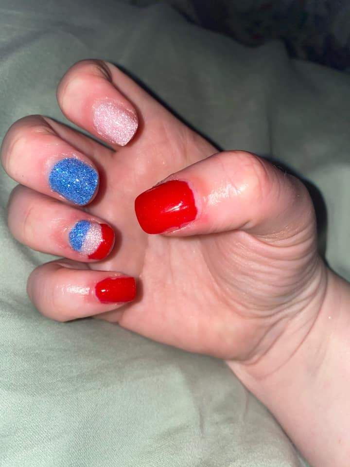 Multicolor mani in various shades of red, white, and blue