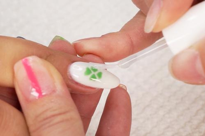 - Place drops of Step 2 Base onto a square of aluminum foil & use a pointed tip to create the clover onto the nail.