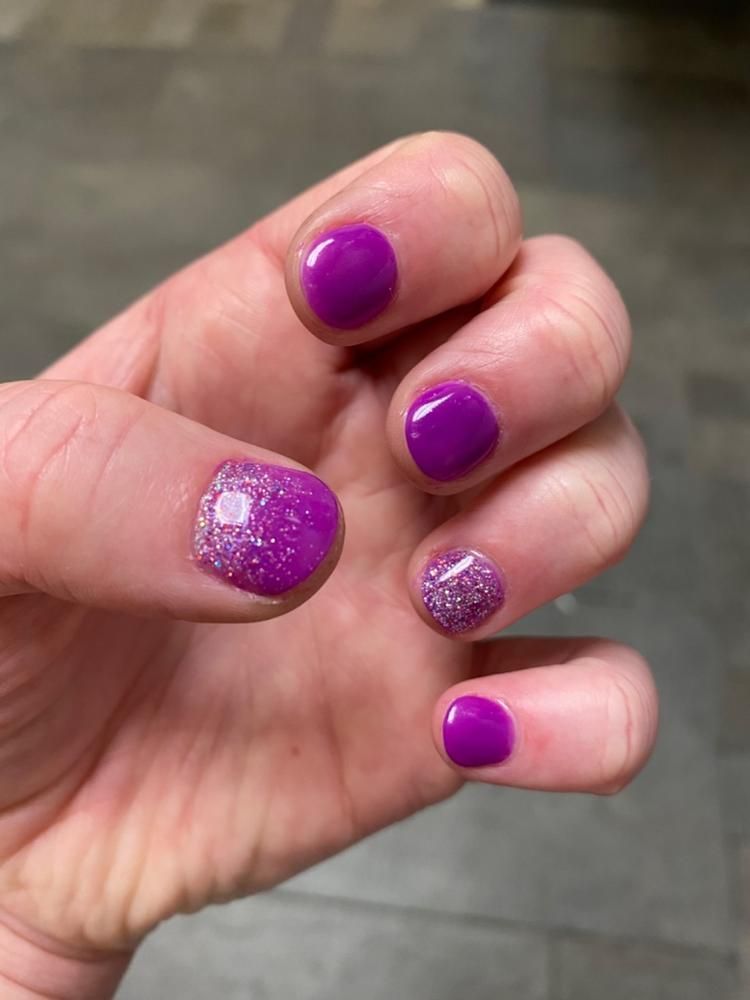 Bright and happy mani featuring NE18 Orchid Purple dip powder. Get the look of these glamorous accent nails using the Glitter Ombre Gold Tip Nails For Christmas tutorial. Image by Mandy H.