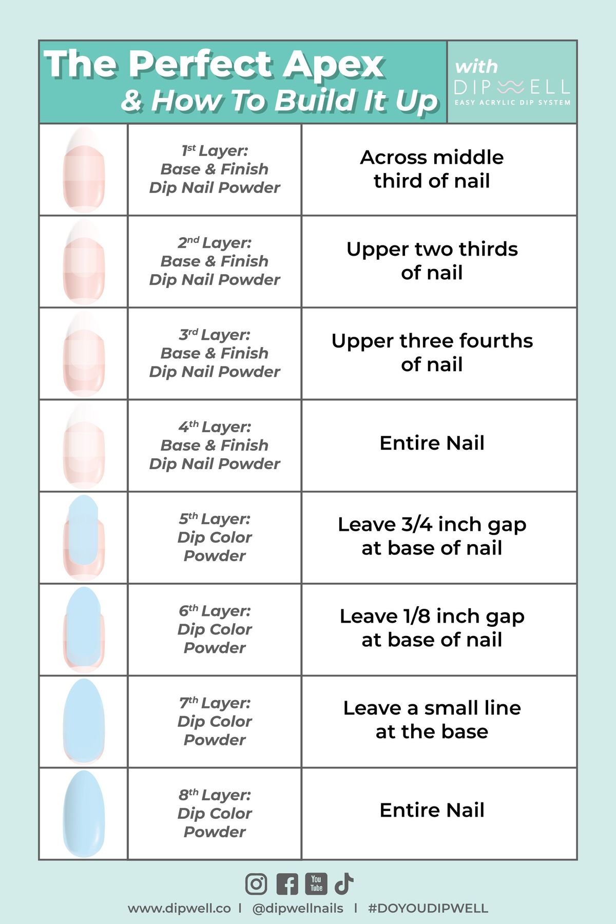 - 3rd Layer: ¾ of the way up the nail, extending almost all the way to the sides