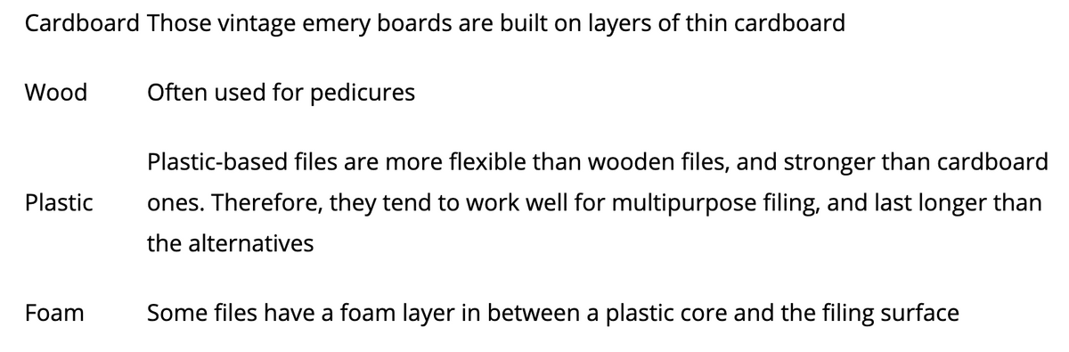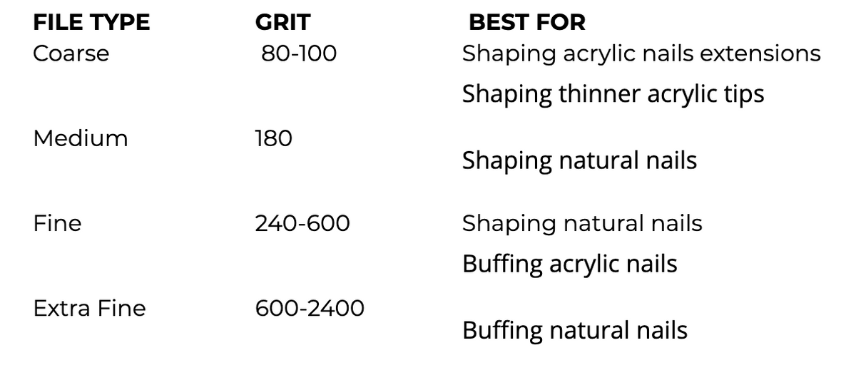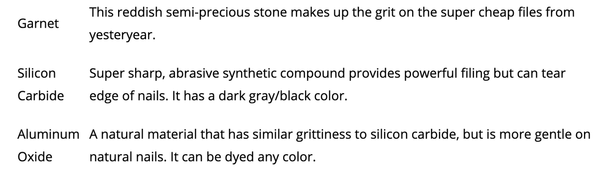 Next up, let's talk material types. The grit - those little grains that do all the work of creating beautiful nail shapes and glossy smooth surfaces, come in several varieties